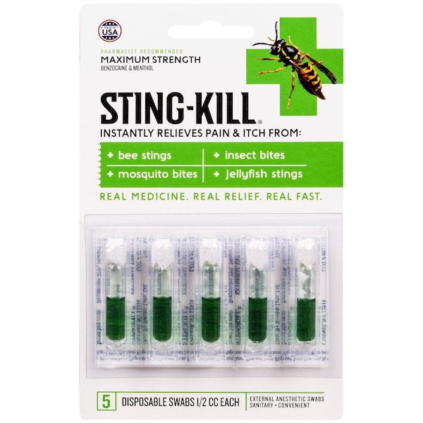 Sting-Kill Swabs are the #1 external anesthetic recommended for the treatment of bee stings and are made in the U.S.A. Bee Stings? No fear, no pain when you have Sting-Kill near. Each card contains 5 single-use sanitary swabs small enough to toss in a pocket, purse, or first aid kit. Pop it out of the paper backing, give it a hard pinch and let the green liquid saturate the tip, and let the relief begin. Approved for ages 2 and up, it's a must for baseball, soccer, and all outdoor athletic events. Be the hero of your activity should a bee come for an aggressive visit.