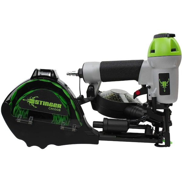 Stinger CN100B 1in Stinger Cap Nailer 136252 The CN100B delivers code compliant cap nails featuring 1in nails with a 1in plastic collated cap that pass 2012 ICC Building Codes.Features: Bumpfire trigger for sequential firing 360 degree exhaust to redirect exhaust The pneumatic cap nailer shoots 1in ring shank, wire coil nails and full 1in plastic collated caps Use with Stinger 1in pneumatic nails #136260 Use for roofing underlayments and housewrap