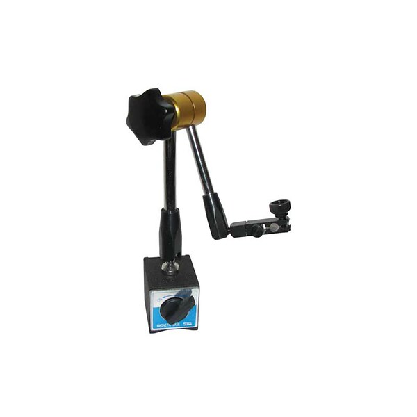 Articulated arm style magnetic base positions and locks easily includes ONOFF switch and central locking knob One knob mechanically tightens both arms Dial gauge holder includes fine adjustment and full 360Deg swivel
