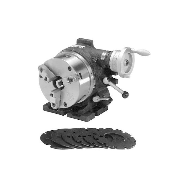 Spacer Type Super Dex Includes Chuck Yes Chuck Diameter Inch 6 Number of Indexing Increments 24 This index combines the advantages of the Simple Index with those of a wormgeared index When mounted on a milling, boring or other machine tool it can carry out singlepurpose indexing and indirect indexing using the wormdrive mechanism Disengaging the worm drive the 24notch master plate permits 2, 3, 4, 6, 8, 12 and 24 dividing When the chuck is removed the unit can be used as a horizontal and vertical type rotary table The operating handle to rotary table worm gear reduction ratio is 190 The operating handle collar is graduated in minutes, and readings down to ten seconds can be set on the vernier