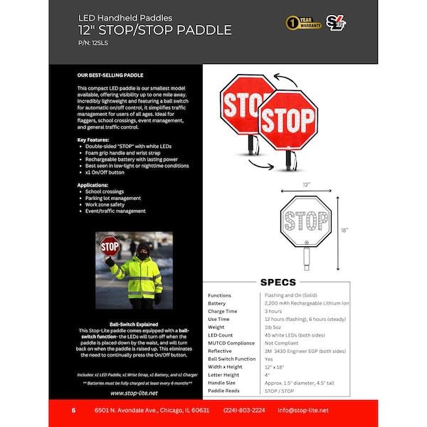12 in Stop-Lite LED Paddle with white illuminated STOP on both sides. This is the smallest paddle in our collection and features 3M branded 3440 Engineer Grade EGP reflective sheeting on both sides. It is lightweight and has a comfortable foam grip handle with a wrist strap. It is eqipped with our ball-switch funciton for easy on/off during use for optimal battery use.