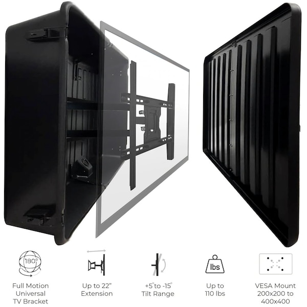 The Storm Shell weatherproof TV enclosure provides year around weatherproof protection for your flat screen TV. The extendable, articulating TV mount is included. The Storm Shell is impact resistant and UV resistant. The front cover is easily removed and can be locked and secured. The extendable, full-motion articulating TV mount extends and swivels 180 degrees for unimpeded viewing. The wall mounting bracket is also included. Fits TVs up to 55"-65" MAX TV dimensions- (LxHxD) 58.25 in. x 34.5 in. x 4.00 in.