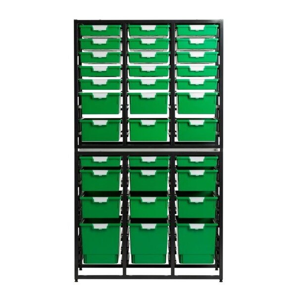 Triple Column Wall Unit – Slim Line - High-Capacity Storage Wall Unit in Black with 21 x Primary Green-3” Slim Line Trays, 12 x Primary Green-6” Slim Line Trays and 3 x Primary Green-12” Slim Line Trays