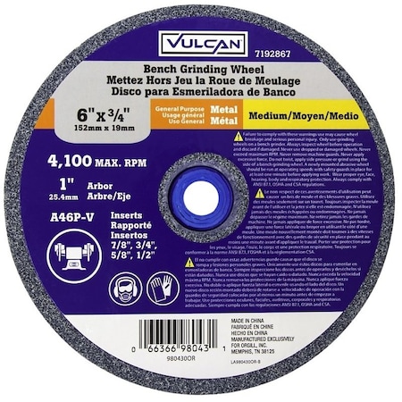 Vulcan Straight Bench Grinding Wheel, 6 In Dia, 1 In, 6 Grit, Medium Grade, 4100 Rpm, Aluminum Oxide