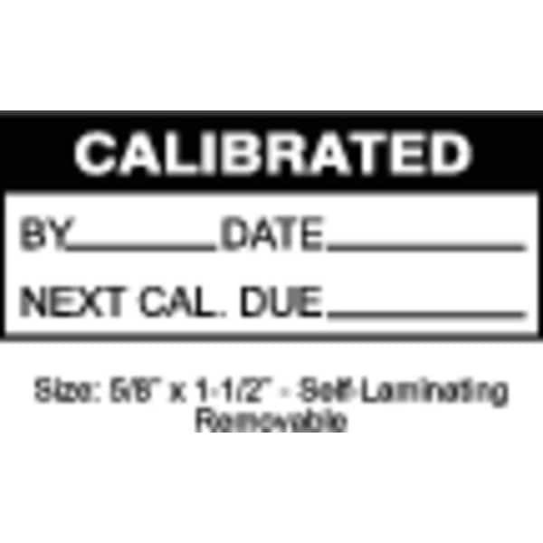 Calibration Label, Adhesive Adhesive, Adhesive Material Acrylic, Adhesive Type Permanent Adhesive, Label Color Black, White, Label Diameter Not Applicable, Label Height 5/8 in, Label Material Polyester, Label Shape Rectangle, Label Width 1 1/2 in, Language English, Number of Labels 350, Preprinted Images Black Header Stripe, Preprinted Legend By_______, Date_______, Next Cal. Due_______, Product Type Calibration Label, Subject Matter Calibration, Indoor/Outdoor Usage Indoor