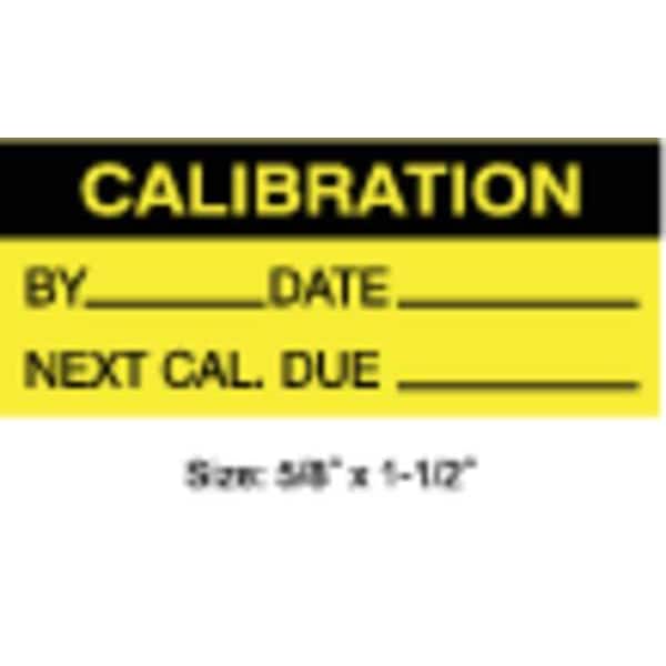 Calibration Label, Adhesive Adhesive, Adhesive Material Acrylic, Adhesive Type Permanent Adhesive, Label Color Black, Yellow, Label Diameter Not Applicable, Label Height 5/8 in, Label Material Polyester, Label Shape Rectangle, Label Width 1 1/2 in, Language English, Number of Labels 350, Preprinted Images Black Header Stripe, Preprinted Legend By_______, Date_______, Next Cal. Due_______, Product Type Calibration Label, Subject Matter Calibration, Indoor/Outdoor Usage Indoor