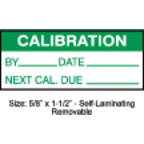 Calibration Label, Adhesive Adhesive, Adhesive Material Acrylic, Adhesive Type Permanent Adhesive, Label Color Green, White, Label Diameter Not Applicable, Label Height 5/8 in, Label Material Polyester, Label Shape Rectangle, Label Width 1 1/2 in, Language English, Number of Labels 350, Preprinted Images Green Header Stripe, Preprinted Legend By_______, Date_______, Next Cal. Due_______, Product Type Calibration Label, Subject Matter Calibration, Indoor/Outdoor Usage Indoor