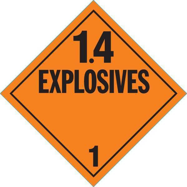 DOT Container Placard, Language English, Container Label/Placard Type Hazardous Class, Hazard Class Class 1 (Explosives), DOT/UN Product Form Placard, Message 1.4 Explosives, Label Width 10 3/4 in, Label Height 10 3/4 in, Material Self-Adhesive Vinyl, Package Quantity 10