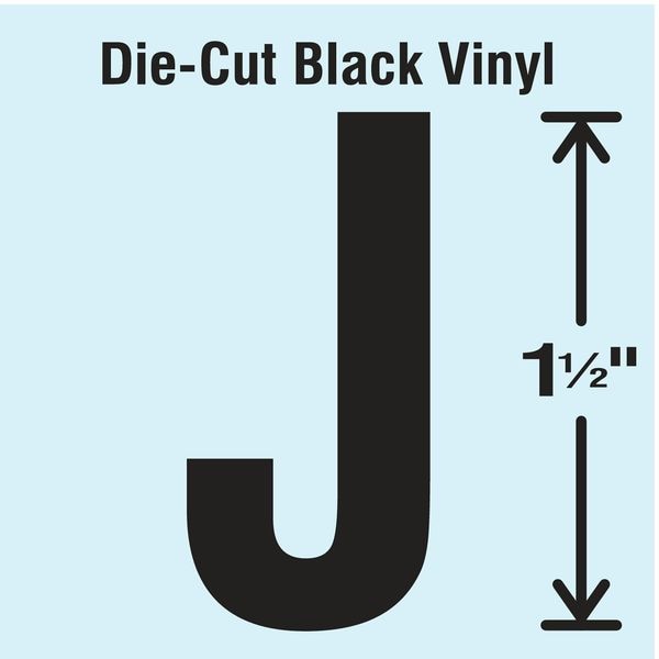 Letter Label, Adhesive Type Permanent Adhesive, Application General Identification, APWA Compliant Color No, Background Color Not Applicable, Character Color Black, Character Color Gradient Solid Color, Character Height 1 1/2 in, Character Outline Color Not Applicable, Character Type Letters, Characters Included J, Die Cut Yes, Embossed No, Font Gothic, Includes (10) Pack, Indoor/Outdoor Usage Indoor/Outdoor, Letter Casing Uppercase, Material Vinyl, Meets USCG Registration Guidelines No