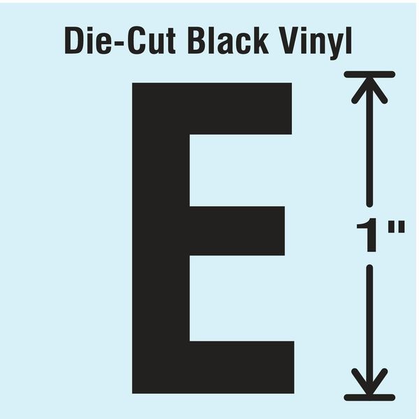 Letter Label, Adhesive Type Permanent Adhesive, Application General Identification, APWA Compliant Color No, Background Color Not Applicable, Character Color Black, Character Color Gradient Solid Color, Character Height 1 in, Character Outline Color Not Applicable, Character Type Letters, Characters Included E, Die Cut Yes, Embossed No, Font Gothic, Includes 1 Pack, Indoor/Outdoor Usage Indoor/Outdoor, Letter Casing Uppercase, Material Vinyl, Meets USCG Registration Guidelines No