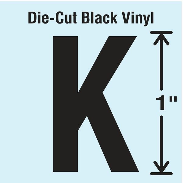 Letter Label, Adhesive Type Permanent Adhesive, Application General Identification, APWA Compliant Color No, Background Color Not Applicable, Character Color Black, Character Color Gradient Solid Color, Character Height 1 in, Character Outline Color Not Applicable, Character Type Letters, Characters Included K, Die Cut Yes, Embossed No, Font Gothic, Includes 1 Pack, Indoor/Outdoor Usage Indoor/Outdoor, Letter Casing Uppercase, Material Vinyl, Meets USCG Registration Guidelines No