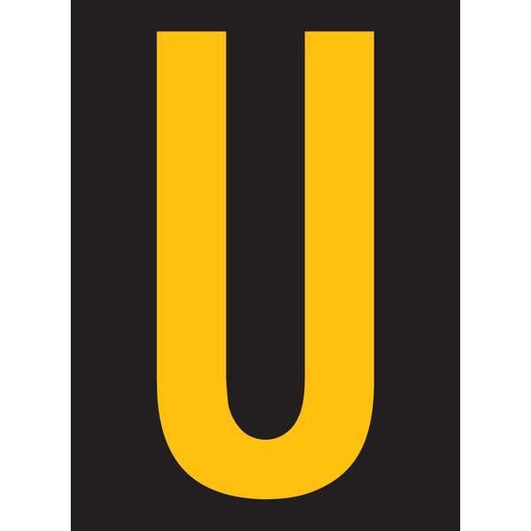 Letter Label, Adhesive Type Permanent Adhesive, Application General Identification, APWA Compliant Color No, Background Color Black, Character Color Yellow, Character Color Gradient Solid Color, Character Height 2 1/2 in, Character Outline Color Not Applicable, Character Type Letters, Characters Included U, Die Cut Yes, Embossed No, Font Swis 721 BT Bold Cn, Includes (25) Markers, Indoor/Outdoor Usage Indoor/Outdoor, Letter Casing Uppercase, Material Vinyl, Meets USCG Registration Guidelines No