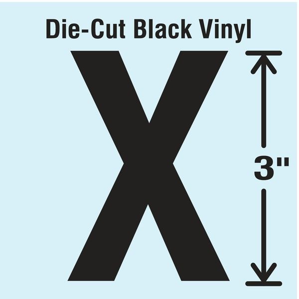 Letter Label, Adhesive Type Permanent Adhesive, Application General Identification, APWA Compliant Color No, Background Color Not Applicable, Character Color Black, Character Color Gradient Solid Color, Character Height 3 in, Character Outline Color Not Applicable, Character Type Letters, Characters Included X, Die Cut Yes, Embossed No, Font Gothic, Includes (10) Pack, Indoor/Outdoor Usage Indoor/Outdoor, Letter Casing Uppercase, Material Vinyl, Meets USCG Registration Guidelines No