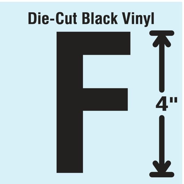 Letter Label, Adhesive Type Permanent Adhesive, Application General Identification, APWA Compliant Color No, Background Color Not Applicable, Character Color Black, Character Color Gradient Solid Color, Character Height 4 in, Character Outline Color Not Applicable, Character Type Letters, Characters Included F, Die Cut Yes, Embossed No, Font Gothic, Includes (10) Pack, Indoor/Outdoor Usage Indoor/Outdoor, Letter Casing Uppercase, Material Vinyl, Meets USCG Registration Guidelines No