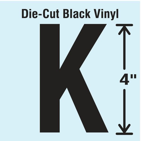Letter Label, Adhesive Type Permanent Adhesive, Application General Identification, APWA Compliant Color No, Background Color Not Applicable, Character Color Black, Character Color Gradient Solid Color, Character Height 4 in, Character Outline Color Not Applicable, Character Type Letters, Characters Included K, Die Cut Yes, Embossed No, Font Gothic, Includes (10) Pack, Indoor/Outdoor Usage Indoor/Outdoor, Letter Casing Uppercase, Material Vinyl, Meets USCG Registration Guidelines No