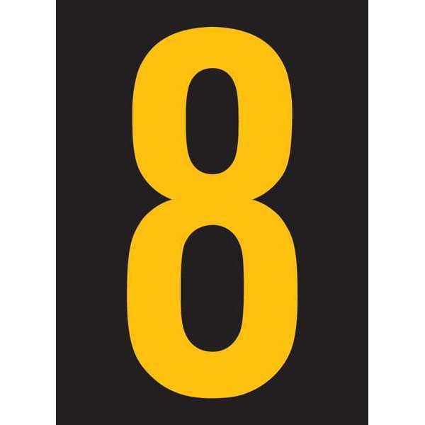 Number Label, Adhesive Type Permanent Adhesive, Application General Identification, APWA Compliant Color No, Background Color Black, Character Color Yellow, Character Color Gradient Solid Color, Character Height 2 1/2 in, Character Outline Color Not Applicable, Character Type Numbers, Characters Included 8, Die Cut Yes, Embossed No, Font Swis 721 BT Bold Cn, Includes (25) Markers, Indoor/Outdoor Usage Indoor/Outdoor, Letter Casing Uppercase, Material Vinyl, Meets USCG Registration Guidelines No