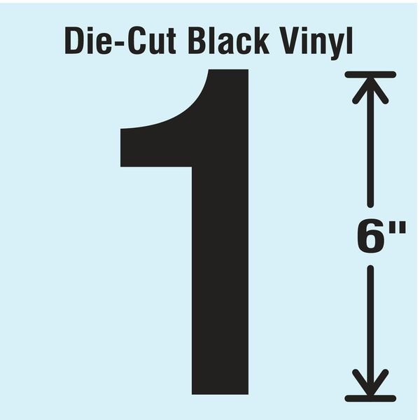 Number Label, Adhesive Type Permanent Adhesive, Application General Identification, APWA Compliant Color No, Background Color Not Applicable, Character Color Black, Character Color Gradient Solid Color, Character Height 6 in, Character Outline Color Not Applicable, Character Type Numbers, Characters Included 1, Die Cut Yes, Embossed No, Font Gothic, Includes 1, Indoor/Outdoor Usage Indoor/Outdoor, Letter Casing Uppercase, Material Vinyl, Meets USCG Registration Guidelines No