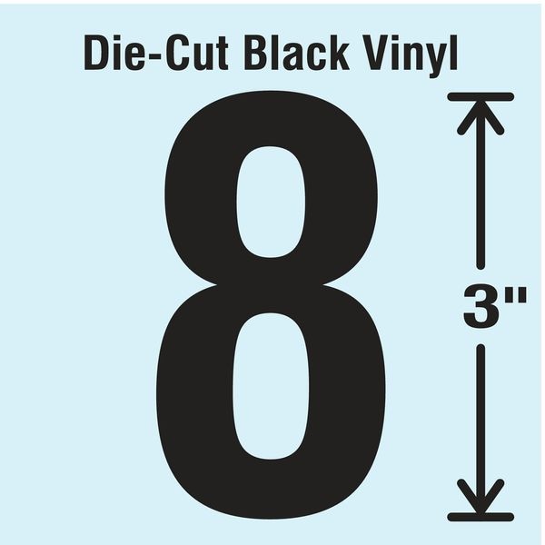 Number Label, Adhesive Type Permanent Adhesive, Application General Identification, APWA Compliant Color No, Background Color Not Applicable, Character Color Black, Character Color Gradient Solid Color, Character Height 3 in, Character Outline Color Not Applicable, Character Type Numbers, Characters Included 8, Die Cut Yes, Embossed No, Font Gothic, Includes (10) Pack, Indoor/Outdoor Usage Indoor/Outdoor, Letter Casing Uppercase, Material Vinyl, Meets USCG Registration Guidelines No