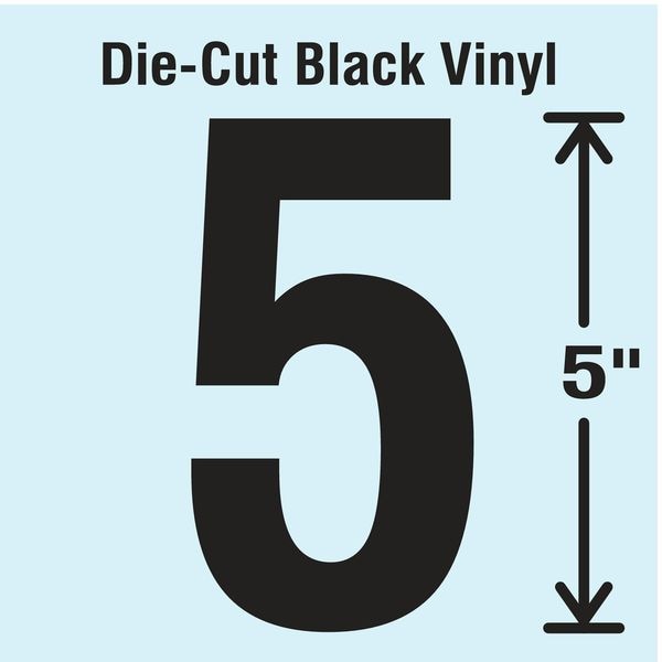 Number Label, Adhesive Type Permanent Adhesive, Application General Identification, APWA Compliant Color No, Background Color Not Applicable, Character Color Black, Character Color Gradient Solid Color, Character Height 5 in, Character Outline Color Not Applicable, Character Type Numbers, Characters Included 5, Die Cut Yes, Embossed No, Font Gothic, Includes (10) Pack, Indoor/Outdoor Usage Indoor/Outdoor, Letter Casing Uppercase, Material Vinyl, Meets USCG Registration Guidelines No