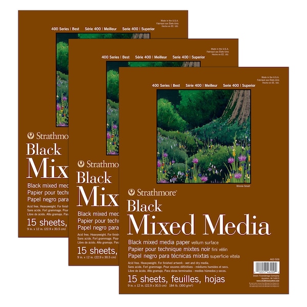 400 Series Mixed Media Pad, Black, Glue Binding, 15 Sheet, 9x12 inch, 3PK