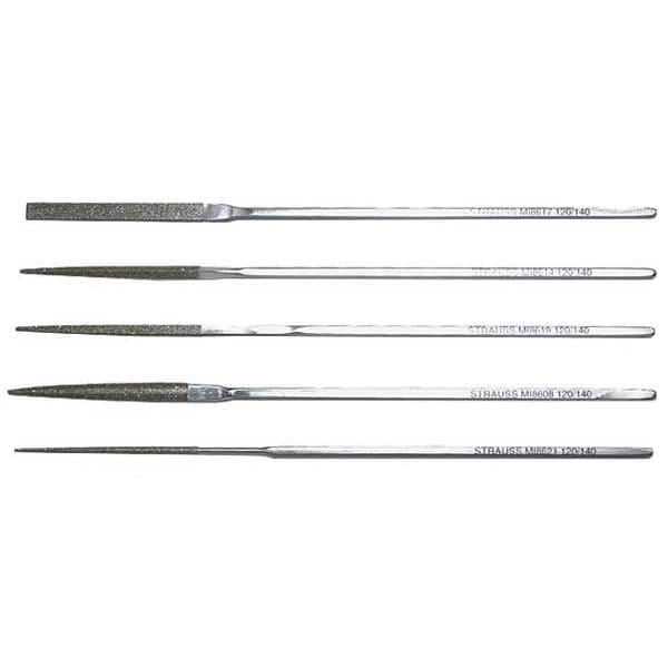 Escapement File Set, File Type Escapement Files, Material Applications Ceramic Materials, Glass, Steels of 40Hrc and Harder, Tungsten Carbide, File Style Swiss Pattern File, File Length without Tang 140 mm, File Set Type Mini Escapement Files Set, Files Included Smooth - 140 mm Equalling File, Smooth - 140 mm Half Round File, Smooth - 140 mm Round File, Smooth - 140 mm Square File, Smooth - 140 mm Three Square File, Profile Shape Equaling, Half Round, Round, Square, Triangular