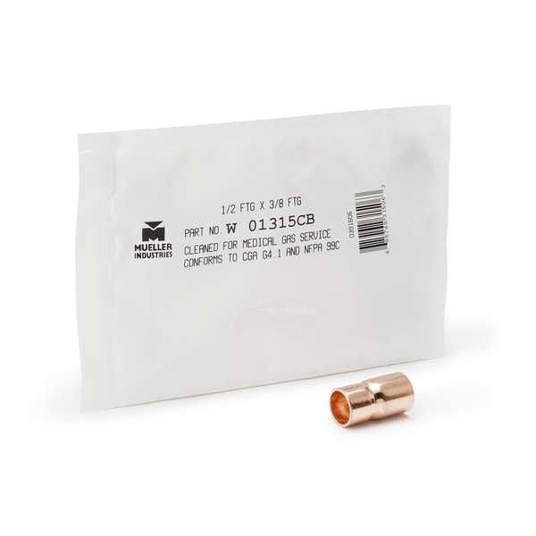 Sweat Fitting Adapter, Application Medical, Fitting Side A Connection Type FTG, Fitting Side B Connection Type Cup, Fitting Side A Copper Tube Size 3/4 in, Fitting Side B Copper Tube Size 1/2 in, Fitting Material Wrot Copper, Fitting Side A Tube Outer Diameter 7/8 in, Fitting Side B Tube Outer Diameter 5/8 in, Maximum Operating Pressure 300 psi, Maximum Operating Temperature 250 Degrees F, Specific Fitting Shape Straight Reducing Coupling, Includes Center Stop No Center Stop
