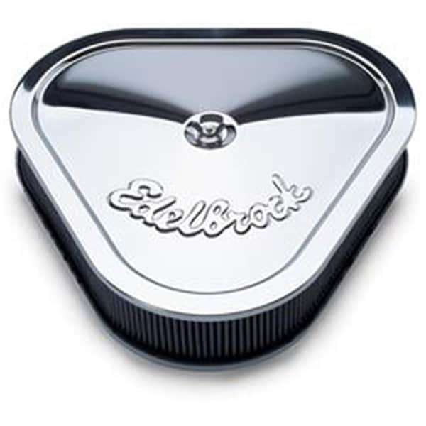 The signature series triangular air cleaner is a new style with a shape reminiscent of the muscle car era. This hot looking chrome air cleaner has the classic signature. This triangular air cleaner comes with high quality 2-1/2 in. washable Pre-Oiled cotton gauze filter for excellent filtration. Designed for use with 5-1/8 in. Diameter carbs Square-Bore Q-Jet etc. the Pro-Flo clears HEI distributors and electric choke housings. Air cleaner dimensions 14-1/8 in. Wide x 13-3/8 in. Long Features -Application - 5-1/8 in. Diameter Carburetor -Shape - Triangle -Flange Diameter - 5-1/8 in. -Diameter - 13-3/8 in. Length X 14-1/8 in. Width -Height - 3-1/2 in. -Finish - Chrome Plated -Color - Silver -Material - Steel