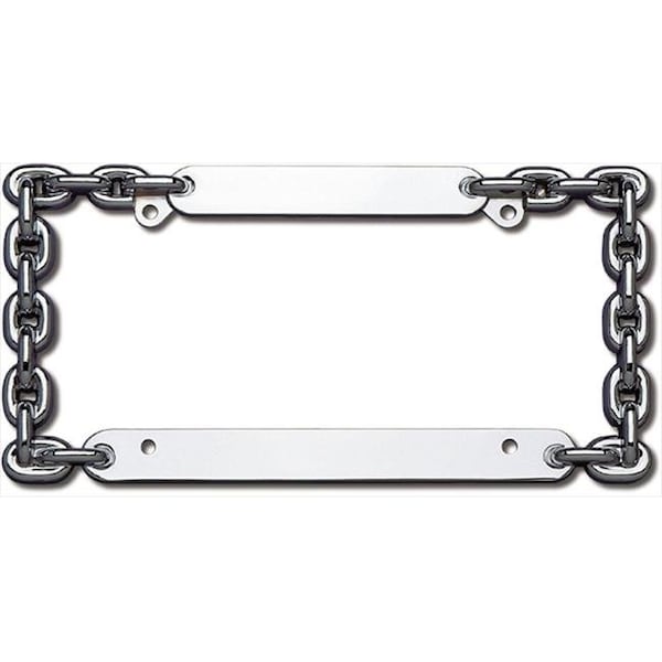 A chrome frame featuring the original chain link design. The frame includes double bars which allow you to personalize or engrave your message. Re-designed with slotted fastener holes, engineered to Show More Plate. Die cast metal is plated with extra heavy show chrome and carefully hand polished. License plates designed to fit all novelty. Easy to install.