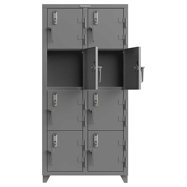 Locker, Frame Assembled Assembled, Leg Height 3 in, Number of Tiers 4, Number of Units Wide 2, Wall-Mounting Type Not Applicable, Handle Type Swing, Locker Color Gray, Mounting Location Freestanding, Mounting Style Surface, Number of Lockers 8, Opening Depth 18 in, Opening Height 18 in, Opening Width 18 in, Overall Depth 18 in, Overall Height 75 in, Overall Width 36 in, Locker Material Steel, Door Material Steel, Door Type Solid, Includes Keys No, Lock Type Electronic Keypad; Padlock Hasp