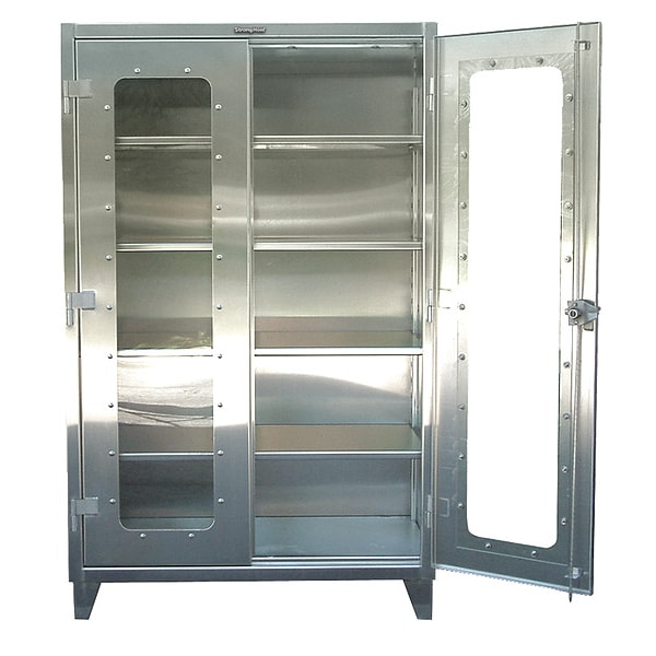 Storage Cabinet, Base Type Legs, Body Panel Type Solid, Cabinet Color Light Gray, Cabinet Material Steel, Cabinet Storage Components Shelves, Door Handle Type Swing, Door Type Clearview, Duty Rating Super Duty, For Use Indoors/Outdoors No, Frame Assembled Assembled, Load Capacity per Shelf 1,650 lb, Lock Type Padlock Hasp, Mobility Stationary, Number of Shelves 4, Overall Depth 24 in, Overall Height 78 in, Overall Width 60 in, Audit Trail Storage None, Number of Doors 2