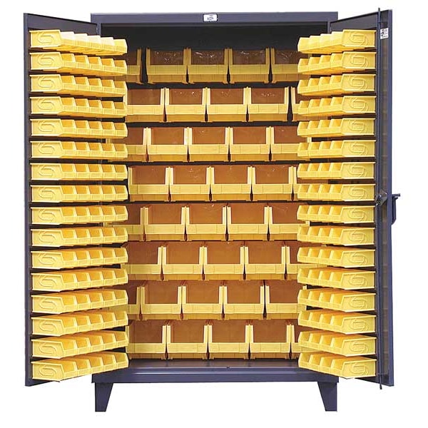 Bin Cabinet, Base Type Legs, Bin Color Yellow, Bin HxWxD (144) 3 in x 4 1/8 in x 7 3/8 in, (40) 7 in x 8 1/4 in x 14 3/4 in, Cabinet Color Gray, Cabinet Storage Components Bins, Shelves, Door Type Flush, Frame Assembled Assembled, Mobility Stationary, Number of Bins 184, Number of Shelves 0, Overall Depth 24 in, Overall Height 78 in, Overall Width 48 in, Bin Depth 7 3/8 in, 14 3/4 in, Bin Height 3 in, 7 in, Bin Louvered Panel Location Door and Cabinet Back, Bin Material Polypropylene