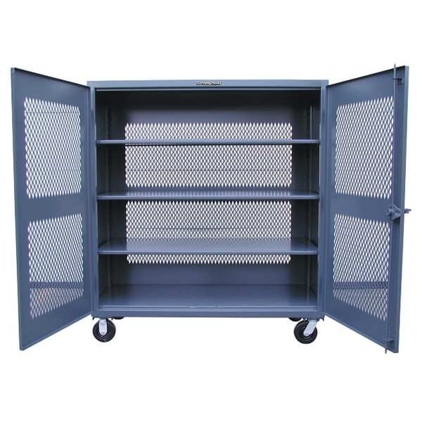 Storage Cabinet, Base Type Casters, Body Panel Type Ventilated, Cabinet Color Dark Gray, Cabinet Material Steel, Cabinet Storage Components Shelves, Door Handle Type Swing, Door Type Ventilated, Duty Rating Super Duty, Frame Assembled Assembled, Load Capacity per Shelf 1,200 lb, Lock Type Padlock Hasp, Mobility Mobile, Number of Shelves 3, Overall Depth 24 in, Overall Height 67 in, Overall Width 48 in, Audit Trail Storage None, Cabinet Finish Baked Enamel, Number of Doors 2