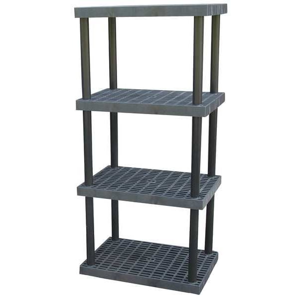 Plastic Shelving, Assembled Unassembled, Adjustability Fixed, Color Black, Frame Material Plastic, Finish Unfinished, Overall Depth 24 in, Overall Height 75 in, Overall Width 36 in, Shelf Style Ventilated, Shelving Material High Density Polyethylene, Commercial Shelving Strength Rating, Whole Unit Load Capacity 1,000 lb, Number of Shelves 4, Load Capacity per Shelf 250 lb, Includes (12) Leg Connectors, (12) Posts, Corrosion-Resistant Resistance Properties