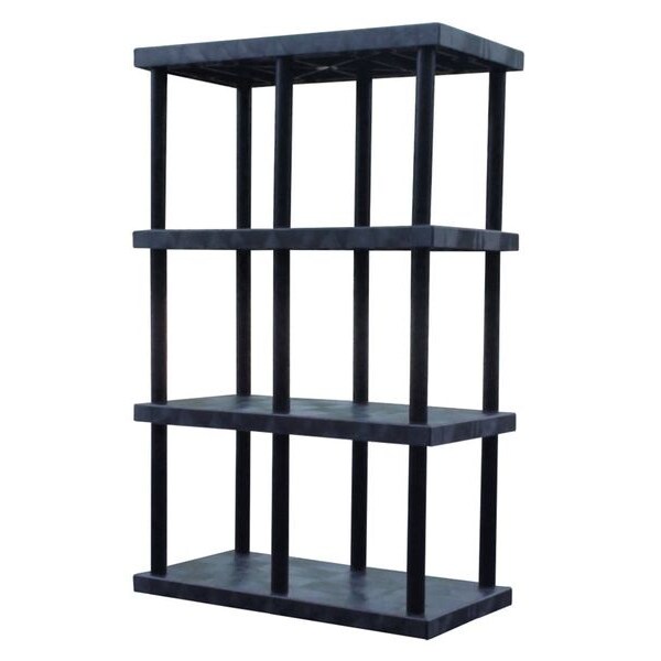 Plastic Shelving, Assembled Unassembled, Adjustability Fixed, Color Black, Frame Material Plastic, Finish Unfinished, Overall Depth 24 in, Overall Height 75 in, Overall Width 48 in, Shelf Style Solid, Shelving Material High Density Polyethylene, Commercial Shelving Strength Rating, Whole Unit Load Capacity 1,760 lb, Number of Shelves 4, Load Capacity per Shelf 425 lb, Includes (18) Leg Connectors, (18) Posts, Corrosion-Resistant Resistance Properties