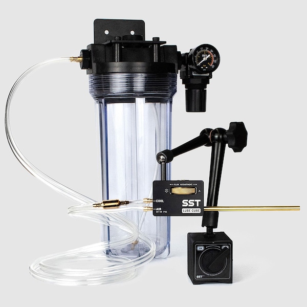 Our HVLP fogless coolant sprayer that delivers a precisely targeted spray to the cutter and work piece without finely atomizing toxic coolants - substantially reducing coolant waste, lubrication over-spray, and hazardous fog. - Extra high resolution knob provides fine control over coolant-to-air mixture ratio and is compatible with most coolant types and oils. We've tested dozens of coolant types, and have found that our Polycarbonate canister is NOT compatible with:- Isopropyl Alcohol- Kool Mist #77 / #78- Extremely tight coolant spread, forming a 3 diameter over 12 of distance, injects Coolant Deep Into Pockets and Holes, while also Clears Chips from Cutter and Workpiece - resulting in Higher Cutting Speeds, Increased Tool Life, and improved cut quality- Magnetic On/Off Base attaches onto metal surfaces at the flip of a switch, while the articulating arm and multi-position mounting points allow you to secure the LUBECUBE at the exact position and angle required for optimal processing.- Fully Pressurized System Delivers a reliable, uninterrupted continuous flow of coolant to the work piece. Its instant on and off response with pressurization, and ease of adjustment, make it a real time saver- Masterfully CNC Machined all Metal Construction and Backed by 5 Year SST WarrantyKit Contents- LUBECUBE Coolant Sprayer Block- Magnetic Base with Articulating Arm- 2 Liter Coolant Cannister with Mounting Bracket- Brass Check Valve- Locking Air Regulator 1/4 NPT Inlet- 5ft of Twin-Line Chemical & Abrasion Resistant Tubing- Coolant Pickup Filter- 6mm Push Fit Connector for air inlet