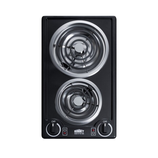 Summit offers an extensive selection of slim-fitting cooktops designed and manufactured in the USA. The CCE212BL is a 115V cooktop with a porcelain surface in a jet black finish. Two coil elements 6in 600W in front and 8in 900W in rear offer durable heating, with removable chrome drip pans included. The push-to-turn knobs are simple and intuitive, with indicator lights that show which burner is in use for added safety. The recessed design helps to contain spills for a cleaner cooking experience. This cooktop includes a 3-pronged 4' long power cord for convenient installation. It is designed to fit common 11-1/8in W x 19-1/8in D counter cutouts. Additional choices are available in white and stainless steel, as well as radiant, induction, and gas cooktops in similar sizes. Browse our website for our complete selection of slim-fitting cooking appliances.