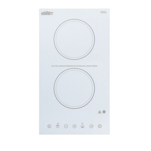 SUMMIT's collection of smooth-top radiant cooktops offers an easy-to-clean design with modern style built for smaller kitchen spaces. The CR2B15T2W is an ENERGY STAR certified 12in wide 115V radiant cooktop designed to fit popular 10-3/4in W x 19-7/8in D counter cutouts. The surface is made from smooth Schott ceramic glass in a classic white finish for a durable, modern look. This unit does not ship with a power cord and must be hard-wired by a professional. Two 5-1/2in burners each feature 1200W operation to cover most cooking needs. The digital touch controls are located in the front for easier accessibility, preventing users from reaching over hot burners to make adjustments. Nine power levels provide true cooking versatility, with a digital display that makes it easy to read and manage the settings at the touch of a button. This unit also includes a timer function that lets you program a power level and cook time up to 99 minutes. The burner turns off automatically when the cooking duration has finished. Safety features include a child lock function, automatic shutoff, and residual heat indicators for both elements. With its attractive design, ideal size, and intuitive touch controls, the CR2B15T2W brings a user-friendly cooking performance with reliable safety to small kitchen spaces.