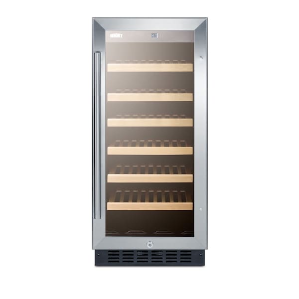 Give your wine collection the proper care with SUMMIT SWC1535B, a slim-fitting wine cellar designed for built-in use under counters. At just 14-3/4in wide, the SWC1535B is thoughtfully sized to store up to 33 Bordeaux style bottles on six slide-out wooden shelves if using this unit for wider Burgundy style bottles, you can remove every other shelf to accommodate their size. An interior LED light provides an elegant view behind a tempered glass door, elegantly trimmed in stainless steel. The reversible door includes a factory installed lock and professional handle. Inside, the digital thermostat makes temperature management easy and intuitive, with indicator lights to show when the interior is ideal for reds, whites, and sparkling wines. The SWC1535B has a jet black cabinet and flush back design for easy installation under any counter. The unit can be used built-in or freestanding. For a matching glass door beverage refrigerator, see the SCR1536B. This model replaces SUMMIT SWC1535.
