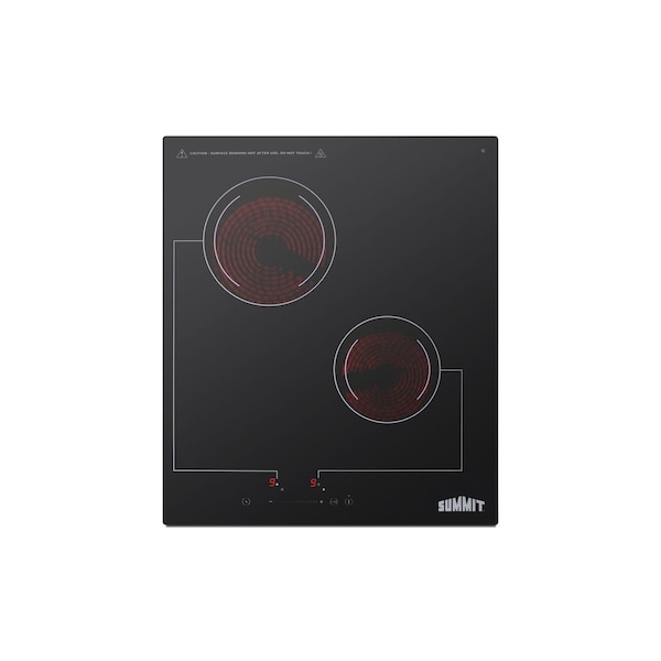 Summit offers a quality lineup of electric cooktops designed to suit any residential or hotel kitchen setup. Made in Europe, the CR2B228T is a 220-240V 2-burner radiant cooktop designed to fit popular 16.5in W x 20.25in D counter cutouts. The surface is made from smooth EuroKera ceramic glass in a jet black finish for a durable, modern look. This unit does not ship with a power cord and must be hard-wired by a professional. Upfront digital controls ensure safe, intuitive use, with slide controls that respond to a gentle touch. The design meets ADA guidelines for user compliance, ensuring those cooking don't have to reach over hot burners to adjust the controls. The rear 7in 1800W burner is ideal for boiling water and heating large cookware, while the front 5.5in 1200W element accommodates basic heating needs. Advanced safety features include automatic shutoff and unintended use protection to turn the burners off if accidentally activated, as well as a child lock function. This unit includes burner indicators and a residual heat indicator to warn if the surface is still hot to touch. A timer function offers added cooking convenience. With its user-friendly design and modern style, the CR2B228T is the perfect addition to smaller kitchen spaces that prioritize convenience and safety, especially in hospitality settings.