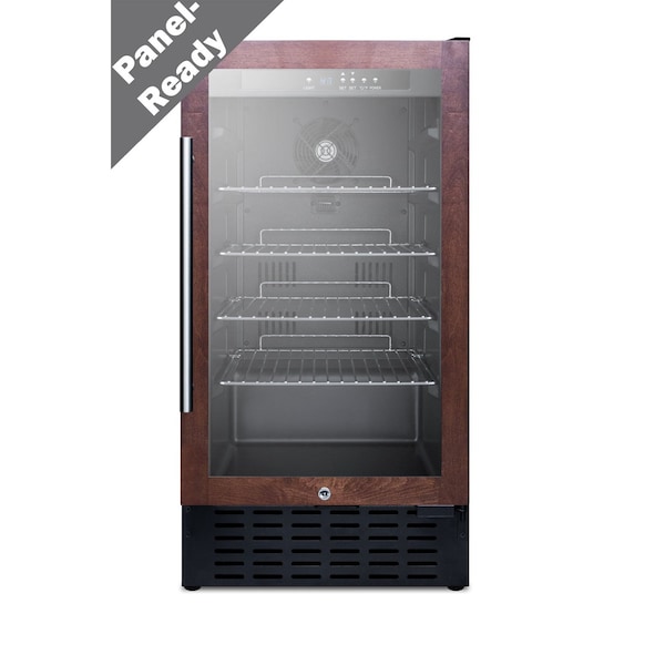 SUMMIT's selection of built-in undercounter beverage coolers combines user-friendly convenience with elegant style for an ideal fit in any setting. The SCR1841BPNR is an 18in wide all-refrigerator designed for use in residential settings. The front-breathing system allows built-in installation under counters, while the fully finished black cabinet also allows freestanding use. The glass door features a panel-ready stainless steel door trim that lets you customize the look to best match adjacent cabinetry panel dimensions: 27-5/8in H x 17-3/8in W at 3/4in minimum thickness. NOTE: this unit ships with a right hand door swing. For a left hand version, add option LHD. Users provide their own handle. Items can be stored on four adjustable chromes shelves in the auto defrost interior, with attractive LED lighting providing an elegant display. The digital thermostat offers intuitive temperature management. The SCR1841BPNR is also available in a 32in height for use in ADA compliant settings see the SCR1841BPNRADA and can be paired with our matching wine cellar, model SWC1840BPNR. Note: Panel is not included. The images provided are meant only to be suggestive of what the product with a wood panel installed could look like. Users must supply their own wood panel.