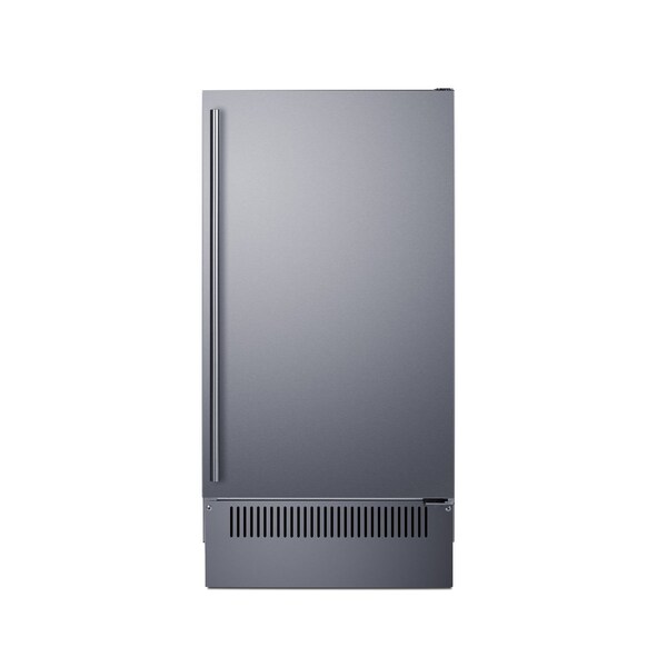 Summit brings proper convenience and streamlined luxury under the counter with built-in clear icemakers sized for 18-inch wide spaces. Sized just under 18 inches wide and 34.75 inches high, model BIM182 features a front-breathing design for built-in installation underneath standard height counters and includes a include a stainless steel kickplate extender to cover any gaps. The height can also be lowered to accommodate ADA-compliant counters. This model comes in a complete stainless steel exterior, with a user-reversible door to best suit your setting. A pro-style handle is included. This unit features a sealed back and right angle cord for added space savings. Inside, the BIM182 can produce 60 lbs. of clear ice cubes ice daily. The intuitive control panel ensures ease of use. An indicator light alerts users to each step in the production process and when the bin is full. The interior features UV lighting for easy visibility and added protection against bacteria. The automatic defrost system minimizes user maintenance. This model has an internal pump and ships with a drain hose, water hose, removable ice bucket, and ice scoop. The interior wall includes a hook to hang the scoop for added convenience. With its unique size, user-friendly design, and large capacity, the BIM182 is a great fit for various kitchen setups. For a weatherproof outdoor version, see model BIM182OS. In addition to this icemaker, Summit manufactures drain-free choices, as well as traditional 15 inch wide icemakers and a full assortment of matching 18-inch wide refrigerators, beverage centers, and wine cellars. Browse the complete lineup to complete any residential or commercial undercounter space.