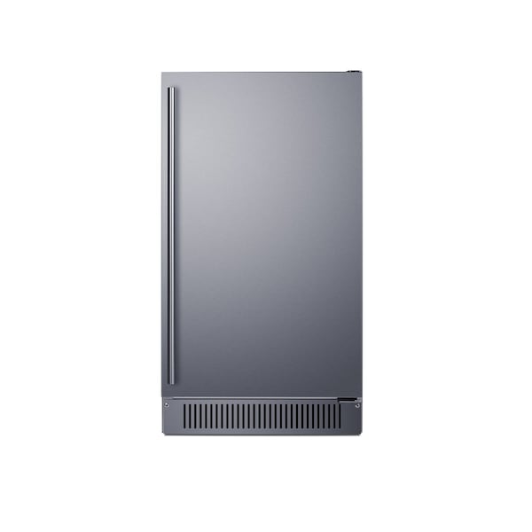 Summit brings proper convenience and streamlined luxury under the counter with built-in indoor and outdoor clear icemakers sized for 18-inch wide spaces in outdoor kitchens. Sized just under 18 inches wide and 32.5 inches high, model BIM182OSADA features a front-breathing design for built-in installation underneath ADA-compliant counters. The height can also be raised to 34.75 inches to accommodate standard counters. We include a stainless steel kickplate extender to fill the gap. This model comes with a user-reversible door to best suit your setting. A pro-style handle is included. The complete stainless steel exterior and sealed rear is specially constructed to hold up to the outdoor elements. Inside, the BIM182OSADA shows can produce 60 lbs. of clear ice cubes ice daily. The intuitive control panel ensures ease of use. An indicator light alerts users to each step in the production process and when the bin is full. The interior features UV lighting for easy visibility and added protection against bacteria. The automatic defrost system minimizes user maintenance. This model has an internal pump and ships with a drain hose, water hose, removable ice bucket, and ice scoop. The interior wall includes a hook to hang the scoop for added convenience. With its unique size, user-friendly design, and large capacity, the BIM182OSADA is a great fit for various kitchen setups. For a weatherproof outdoor version in a standard height, see model BIM182OS. For a panel-ready version, see model BIM182ADAIF. In addition to this icemaker, Summit manufactures drain-free choices, as well as traditional 15-inch wide icemakers and a full assortment of matching 18-inch wide refrigerators, beverage centers, and wine cellars. Browse the complete lineup to complete any residential or commercial undercounter space.