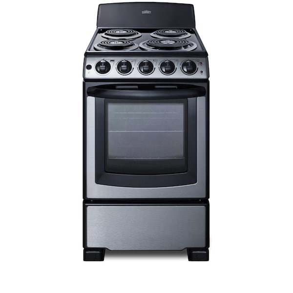Summit brings unmatched value and convenience to apartments, tiny homes, and other small kitchens with fully featured electric ranges in 20in wide fits. Made in North America, the PROEL20SS is a 240V electric range designed for 20in wide spaces, featuring one 8in and three 6in coil burners. For added safety, each coil is equipped with a sensor that will automatically cycle the element off if it reaches dangerous flashpoint temperatures. Heating will resume automatically. All cooking controls are located upfront on push-to-turn knobs for safe and easy use. Indicator lights illuminate when the oven is in use. The PROEL20SS features a large oven window with an interior light to make it easy for users to monitor their cooking. Inside the PROEL20SS features a large 2.3 cu.ft. oven made from durable porcelain, with two adjustable racks. The waist-high broiler is conveniently located inside, letting you finish your cooking without transferring contents to an inconvenient drop-down compartment on the floor. The PROEL20SS features a stainless steel exterior door with a jet-black handle and knobs for a contemporary kitchen design. With its slim fit and quality design, this unit is the ideal choice for space-challenged kitchens on a budget. For this unit in a 24in width see model PROEL24SS. For this unit in white or black, see models RE203W and RE2031B. Summit also manufactures smooth-top ranges, and gas units. Browse our website to explore the complete cooking collection.