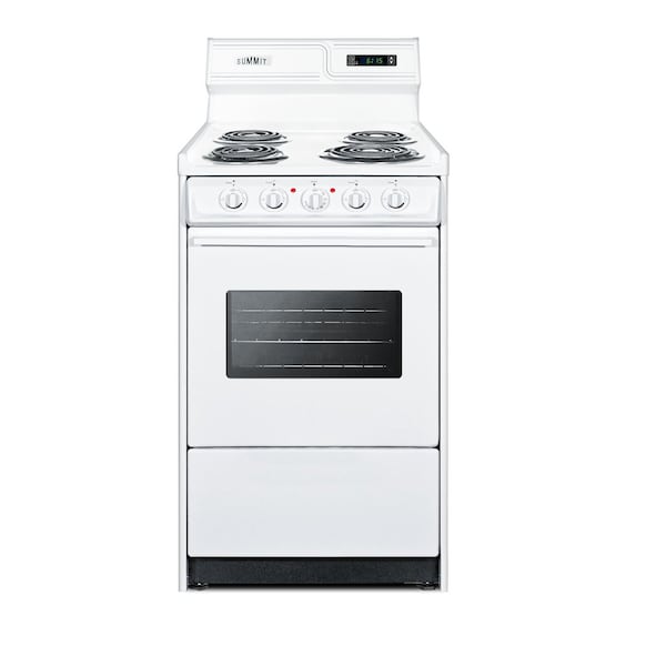 Summit Appliance offers a wide selection of American-made household ranges built for long-lasting durability in space-challenged kitchens. The WEM130KW is an apartment-sized 220V electric range sized at just 20in wide, with a generous 2.46 cu.ft oven interior that can accommodate large trays. The oven features a door window and interior light with an on/off switch to make it easy to monitor your cooking without opening the door. Two adjustable oven racks are included. The waist-high broiler is located inside the oven, allowing you to switch functions without moving contents to a separate compartment on the floor. The lower drop-down storage compartment is ideal for keeping pots and pans out of the way in small kitchens. Designed to meet the most current UL safety standards, this unit features one 8in 950W and three 6in 650W coil elements. These operate at lower wattage than standard electric ranges, allowing for a slow but steady heating process that will not cycle off. Upfront push-to-turn knobs offer additional protection, ensuring users won't reach over hot burners to adjust the heat. This unit complies with ADA guidelines. The WEM130KW comes in a classic white finish to suit any kitchen. It has a recessed oven door and is conveniently sized at just 24in deep for a better fit in galley in L-shaped kitchens, where every inch counts. Porcelain and steel construction help the unit hold up to years of daily use. We include an anti-tip bracket for added safety. This unit does not include a line cord a standard 40 amp 3 or 4-prong cord can be installed by your electrician. With its classic style and quality construction, Summit's made in the USA cooking line offers reliable cooking for smaller homes. Additional choices are available in 24in, 30in, and 36in wide fits.