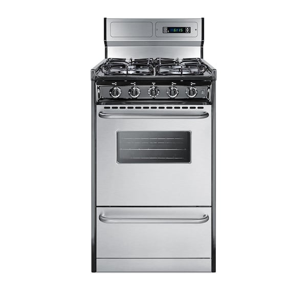 Summit Appliance offers a wide selection of American-made household ranges built for long-lasting durability in space-challenged kitchens. The TTM1307BKSW is 20in wide apartment-sized gas range with a generous 2.46 cu.ft porcelain oven interior that can fit large trays. Two adjustable oven racks are included. An oven window and on/off interior light allow you to easily keep watch over your cooking. The broiler is located below the oven in a drop-down compartment. Four sealed 9100 BTU gas burners accommodate most of your stovetop heating needs, with upfront push-to-turn knobs that let you adjust your cooking without reaching over hot burners. This unit utilizes an electronic ignition system for added safety. Stainless steel doors feature professional style towel bar handles, bringing classic elegance to smaller kitchen spaces. The deluxe 8in high backguard includes a digital clock and timer for added convenience when cooking. This unit has a recessed oven door and is conveniently sized at just 24in deep for a better fit in galley in L-shaped kitchens, where every inch counts. With its classic style and quality construction, Summit's made in the USA cooking line offers reliable cooking for smaller homes. Additional choices are available in 24in, 30in, and 36in wide fits. This unit ships ready for natural gas connections. To use with propane, add the Kit LP S2.