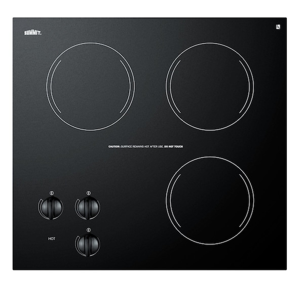 SUMMIT CR3240 is a three-burner 230V electric cooktop that brings outstanding value to kitchen counters. Made from Eurokera ceramic glass, the CR3240 offers modern style and convenience with an easy-to-clean jet black cooking surface. Three 1200W radiant elements feature a 6in diameter, manufactured by E.G.O. in Germany. Push-to-turn control knobs provide infinite heat control. A residual heat light indicates when the surface is still hot. This unit is made in Europea and designed to fit counter cutouts that are 19-7/8in wide by 18-3/8in long. Also available with one and two burners, SUMMIT CR electric cooktop series offers top performance in a quality design.