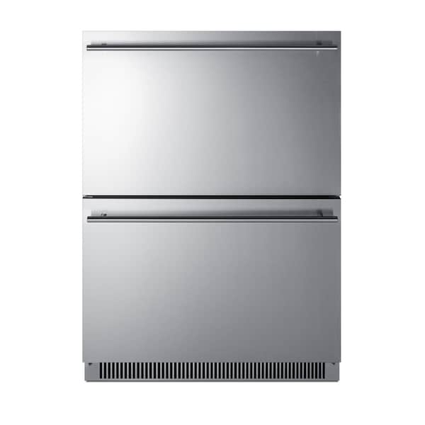 Summit offers unmatched versatility and elegance to meet your indoor and outdoor refrigeration needs. The ADFD2D24 is a two-drawer all-freezer sized at 32 inches high for installation under ADA compliant counters. We include an extra stainless steel kickplate and leveling legs to raise the height to 34-1/2 inches to suit more standard applications. The front-breathing design and finished cabinet allow for built-in or freestanding use. Complete 304 stainless steel construction inside and out offers durability in a professional look. Soft close glides deliver added safety by preventing the drawers from slamming. The drawers can be customized with overlay panels to match or accent existing cabinetry design, while the stainless steel kickplate and stylish handles complete the look recommended panel dimensions: 23.34in W x 13.93in D at 3/4in thick. Frost-free operation ensures minimum user maintenance inside the 3.5 cu ft. interior. Two adjustable dividers allow for flexibility in storage, while the removable basket provides additional storage options. Additionally, removable drawers provide versatility and easy cleaning of the unit's interior. The LED light makes it easy to view stored contents when loading or unloading each drawer. Additional features ensure efficiency and ease of use. These include temperature and open drawer alarms. The digital thermostat and display make it easy to manage the temperature. A temperature memory function helps to recover temperature settings in the event of a power loss, while Sabbath Mode disables certain electrical features for up to 96 hours during periods of religious observance. The ADFD2D24 is perfect for use in home or commercial settings. This unit is ETL-S listed to NSF-7 standards, and its ENERGY STAR certification assures efficient and environmentally friendly operation. For a matching refrigerator, see model ADRD24.