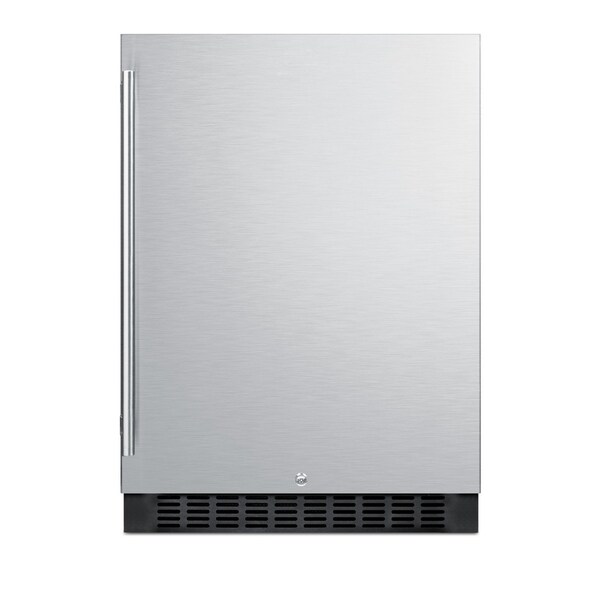 SUMMIT's FF64B Series brings quality and convenience under the counter with a fully featured lineup of built-in all-refrigerators. Sized with a convenient 24in footprint, the FF64BSS refrigerator can be used built-in or freestanding. It has a black cabinet with a sealed back. The reversible stainless steel door includes a factory installed lock and a professional style handle. Inside, the FF64BSS utilizes frost-free operation with fan-forced cooling to ensure low maintenance and even temperature distribution. Recessed LED lighting offers an attractive yet efficient look. The digital thermostat makes it easy to manage the interior temperature. This unit includes adjustable glass shelves for flexible and spill-proof storage. The floor is specially slotted to hold bottles in place. Additional features include an open door alarm, high temperature alarm, and Sabbath mode setting that lets you disable some of the electrical elements during periods of observance. The FF64BSS refrigerator is ETL-S listed to NSF-7 commercial standards and is ENERGY STAR certified as a commercial refrigerator. It also meets DOE standards for residential applications, using 20% less energy than the maximum allowed for this product class and capacity. With its deluxe style and user-friendly features, this unit is the perfect choice for home or commercial kitchens. For a matching frost-free all-freezer, see the SCFF53BSS.