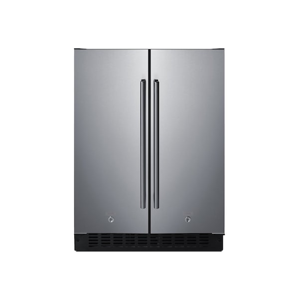 SUMMIT brings quality and value under the counter with the industry's largest collection of built-in refrigeration. Sized at 24in wide, the FFRF24SS is an all-in-one side-by-side refrigerator-freezer. The front breathing design allows built-in installation under counters, while the fully finished black cabinet also enables freestanding use. This unit features stainless steel wrapped doors with a horizontal grain and pro style handles. Each compartment has a factory installed front lock for added security. The sealed rear and right angle plug offer a better fit. Inside, the FFRF24SS features a frost-free freezer compartment on the left and a frost-free refrigerator compartment on the right. The refrigerator includes a digital thermostat allowing users to manage the temperature in each compartment, with a readout in Celsius or Fahrenheit for added convenience. Adjustable glass shelves offer cleaner spill-proof storage for fresh food items, while two removable door shelves provide additional storage space as needed. An internal fan assures the compartment is cooled evenly from top to bottom. The freezer compartment includes adjustable wire shelves to ensure proper cold air circulation. Both sides feature LED lighting to provide an attractive, energy efficient presentation. The slotted floor design is ideal for keeping bottles safely in place. Additional features include an open door alarm, high temperature alarm, and Sabbath mode setting that allows you to disable certain functions during religious observance. With its innovative all-in-one design, user-friendly features, and full frost-free operation, the FFRF24SS is a great choice for smaller kitchens looking to maximize storage space under the counter.