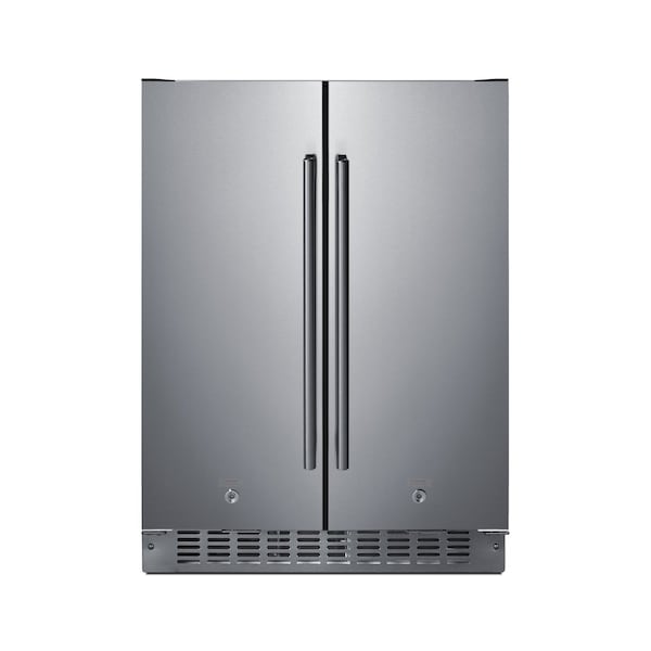SUMMIT brings quality and value under the counter with the industry's largest collection of built-in refrigeration. Sized at 24in wide, the FFRF24SSCSS is an all-in-one side-by-side refrigerator-freezer. The front breathing design allows built-in installation under counters, while the fully finished cabinet also enables freestanding use. This unit comes in a complete stainless steel wrapped exterior, including the kickplate and pro style handles. Each compartment has a factory installed front lock for added security. The sealed rear and right angle plug offer a better fit. Inside, the FFRF24SSCSS features a frost-free freezer compartment on the left and a frost-free refrigerator compartment on the right. The refrigerator includes a digital thermostat allowing users to manage the temperature in each compartment, with a readout in Celsius or Fahrenheit for added convenience. Adjustable glass shelves offer cleaner spill-proof storage for fresh food items, while two removable door shelves provide additional storage space as needed. An internal fan assures the compartment is cooled evenly from top to bottom. The freezer compartment includes adjustable wire shelves to ensure proper cold air circulation. Both sides feature LED lighting to provide an attractive, energy efficient presentation. The slotted floor design is ideal for keeping bottles safely in place. Additional features include an open door alarm, high temperature alarm, and Sabbath mode setting that allows you to disable certain functions during religious observance. With its innovative all-in-one design, user-friendly features, and full frost-free operation, the FFRF24SSCSS is a great choice for smaller kitchens looking to maximize storage space under the counter.